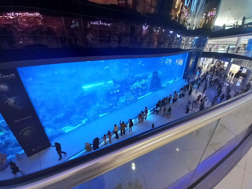 Making our way back down, we had time to kill before the first fountain show which takes place each evening. The first stop we had was to see the giant aquarium and see all the fish swimming. We were told before to go up one floor as the row gets crowded and you struggle to see the fish. Having worked in one before, I wasn’t keen on entering and going around but the tank was a lot larger than I thought it would be. My partner commented and said, “What do you expect, it’s Dubai?”